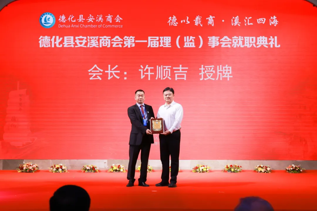 11月1日,德化县安溪商会第?届第?次会员?会暨理监事会就职典礼举行。县长吴志朴、县政协主席张秋英等县领导出席典礼。许顺吉当选为德化县安溪商会第一届理事会会长。