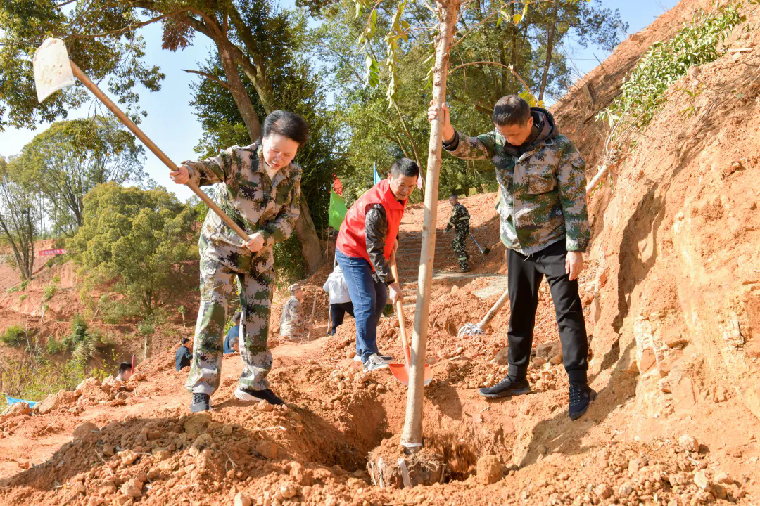 在植树活动现场,方俊钦、吴志朴、张秋英等县领导与干部群众一同上阵,大家精神饱满、分工协作、配合有序,有的挥锹培土、有的扶苗固根、有的提水浇灌,现场氛围热烈、干劲十足,呈现出一派繁忙有序的植树景象。经过一番辛勤劳动,当天,县领导与干部群众共种下铁冬青、紫花风铃木、乐昌含笑等花化苗木400多株,种植面积约10亩,新种下的小树苗迎风挺立,焕发出蓬勃生机与绿色希望。