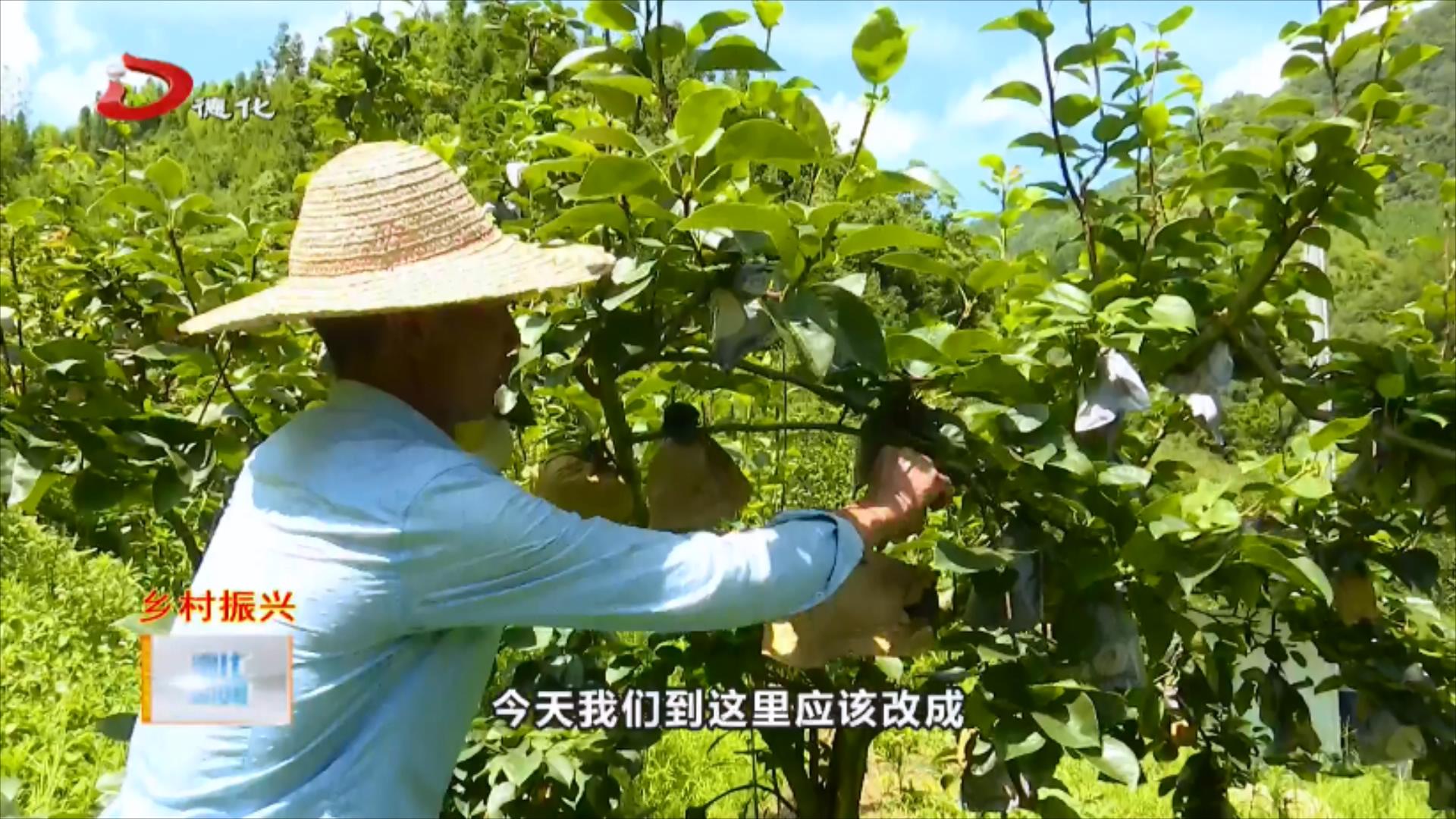 【同期声:主持人 王九鼎:今天我们来到了葛坑镇龙漈村龙珠农场苏大叔的果园里,刚刚在我们没进来的时候就已经闻到了梨子的香味,唐朝诗人岑参写过,忽如一夜春风来,千树万树梨花开。今天我们到这里应该改成忽如一阵清风来,千树万树梨香来。我们能看到这些梨子果实非常圆润饱满,特别招人喜爱。苏大叔告诉我们这里的采摘期也是最近半个多月的时间,如果有喜欢吃梨子的老铁们一定要在最近一段时间,亲自过来采摘,亲自过来品尝,亲自过来体验。】